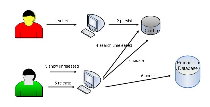 Let's make an example: User A changes the account number in an account object which is controlled by FOUR_EYES actuator. The updated state of the object is stored in Cibet but the object itself is not updated. Later on user A remembers that not only the bank account but also the bank name must be changed. If he tries to update the account with the changed bank name he will receive a warning that an unreleased update exists already for this account. He has two choices now: